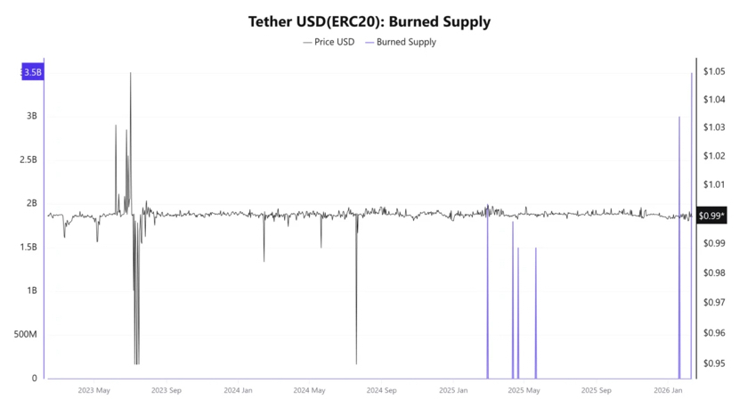 Penurunan ini bisa disebabkan oleh aktivitas burn USDT yang baru-baru ini dilakukan oleh Tether. Pada 10 Februari, Whale Alert melaporkan bahwa Tether membakar 3,5 miliar USDT. Perusahaan ini juga membakar 3 miliar USDT bulan lalu.