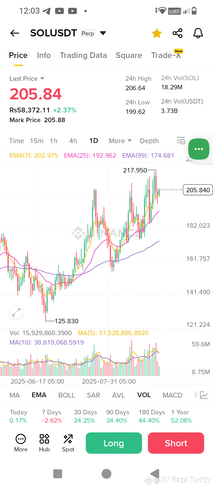 Trend: Price is in an uptrend (higher highs & higher lows). Current price (205.84) is above the EMAs (7, 25, 99), which usually signals bullish strength.