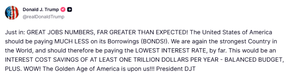 ● Die Worte, die Trump auf Truth Social gepostet hat, sind sehr bemerkenswert. Er erwähnte nicht, dass "die Inflation kontrollierbar ist", und er hat Powell nicht wie gewohnt kritisiert, sondern formulierte die Zinssenkungen als ein Privileg starker Länder – "Wir sind die Nummer eins in der Welt, also sollten wir die niedrigsten Zinssätze zahlen".