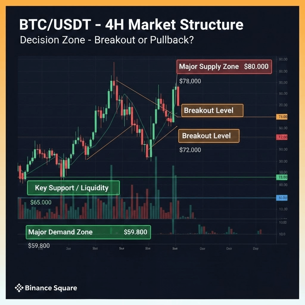 $BTC On the upside, the first key resistance is positioned around $72,000, which previously acted as a breakdown zone. A decisive breakout with strong volume above this level could open the path toward the major supply area between $78,900–$80,000. However, if BTC fails to break $72K convincingly, we may see a liquidity sweep back toward $65K before the next expansion move. Traders should closely monitor volume spikes, rejection wicks, and 4H structure shifts. The market is approaching a critical decision point — disciplined entries near support or confirmed breakout strategies offer the best risk-to-reward setups in current conditions.