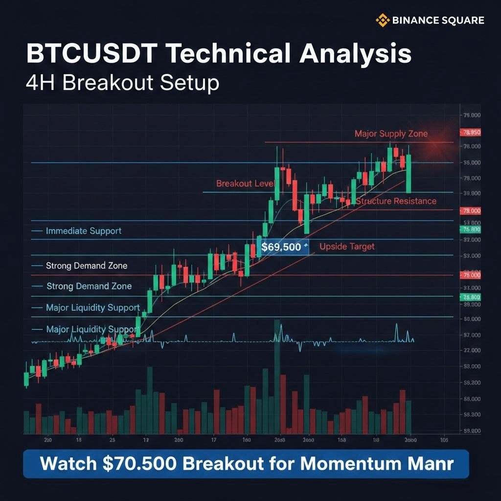 Bullish Scenario: Buy on breakout above $70,500 with strong volume confirmation.