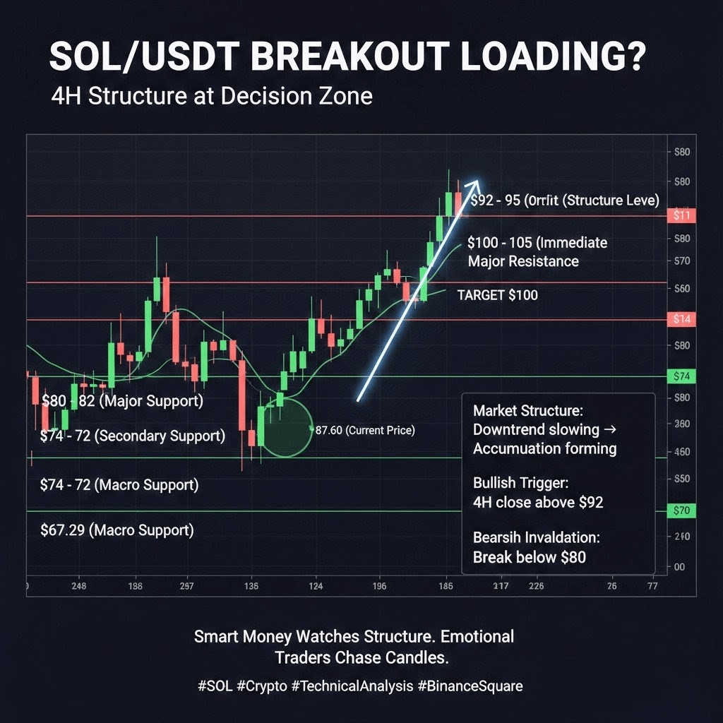 $SOL Solana (SOL) is currently trading near $87.60, showing signs of recovery after a sharp corrective phase from the $144 high down to the recent swing low at $67.29. The 4H market structure clearly reflects a strong bearish trend over the past weeks; however, price action is now stabilizing above the critical $80–82 demand zone, indicating potential accumulation.
