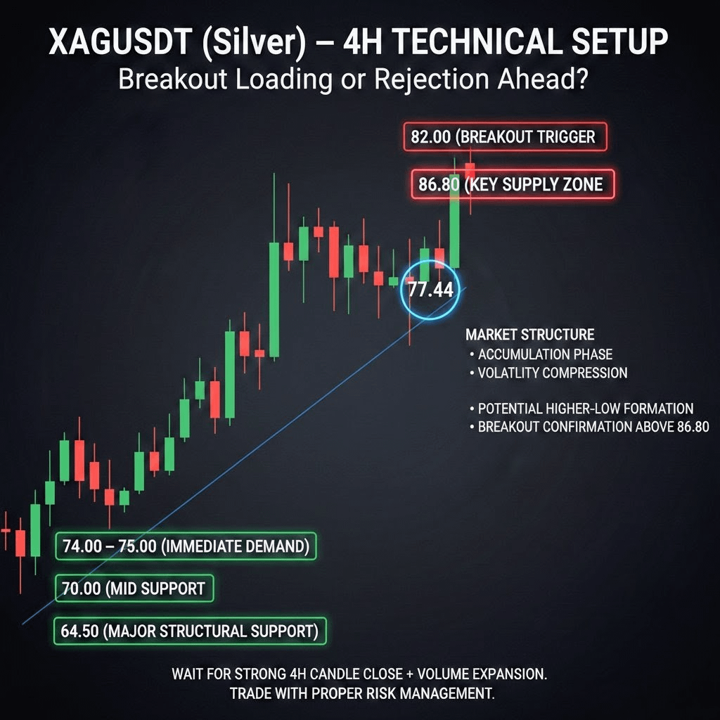 $XAG XAGUSDT is currently trading around the 77.40 region on the 4H timeframe, showing signs of base formation after a strong corrective move from the major swing high near 121.74. The market previously experienced an aggressive sell-off, forming a structural low around 64.52, which now stands as a strong macro demand zone. Since that bottom, price action has shifted into a consolidation phase, indicating accumulation rather than continuation of bearish momentum. The repeated defense of the 74.00–75.00 area confirms this zone as immediate short-term support.
