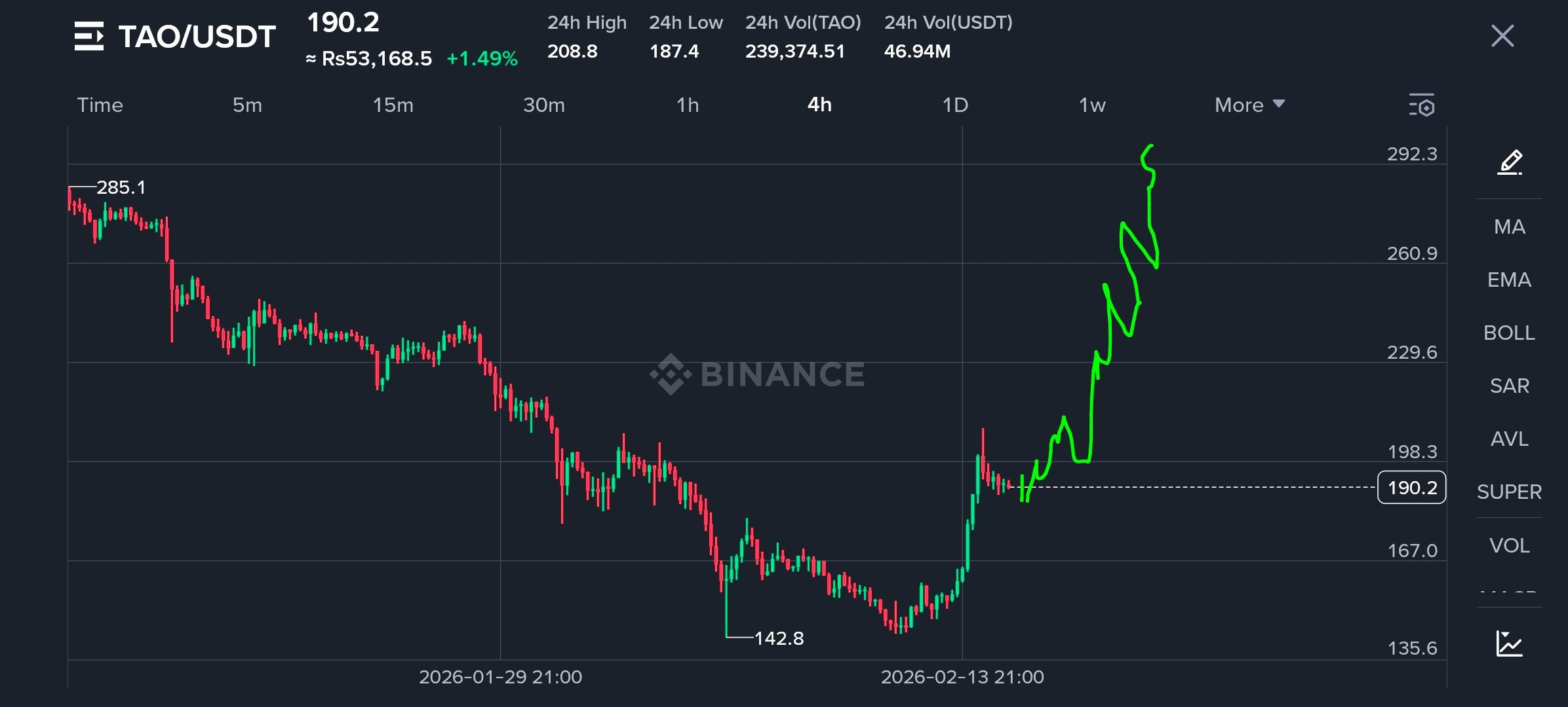 $TAO Bittensor (TAO) is currently trading near $191 on the 4H timeframe after staging a powerful rebound from the $142.8 swing low. The chart structure shows a clear shift from a prolonged downtrend into a short-term bullish recovery, supported by rising volume and strong impulsive candles. This V-shaped reaction signals aggressive accumulation at lower levels. However, price is now approaching a critical resistance zone between $205 and $208, which aligns closely with the recent 24-hour high at $208.8. A decisive breakout and 4H close above this region could confirm bullish continuation, opening the path toward $220 and potentially $240–245 in the mid-term.