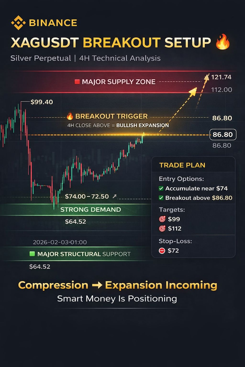 $XAG XAGUSDT is currently trading around $77.43 after a sharp correction from the major swing high near $121.74. The market formed a strong bottom around $64.52, which now acts as a key macro support zone. Since then, price has been consolidating between $74 – $86, forming a clear accumulation structure on the 4H timeframe. Volatility has compressed, which often precedes an explosive breakout move.