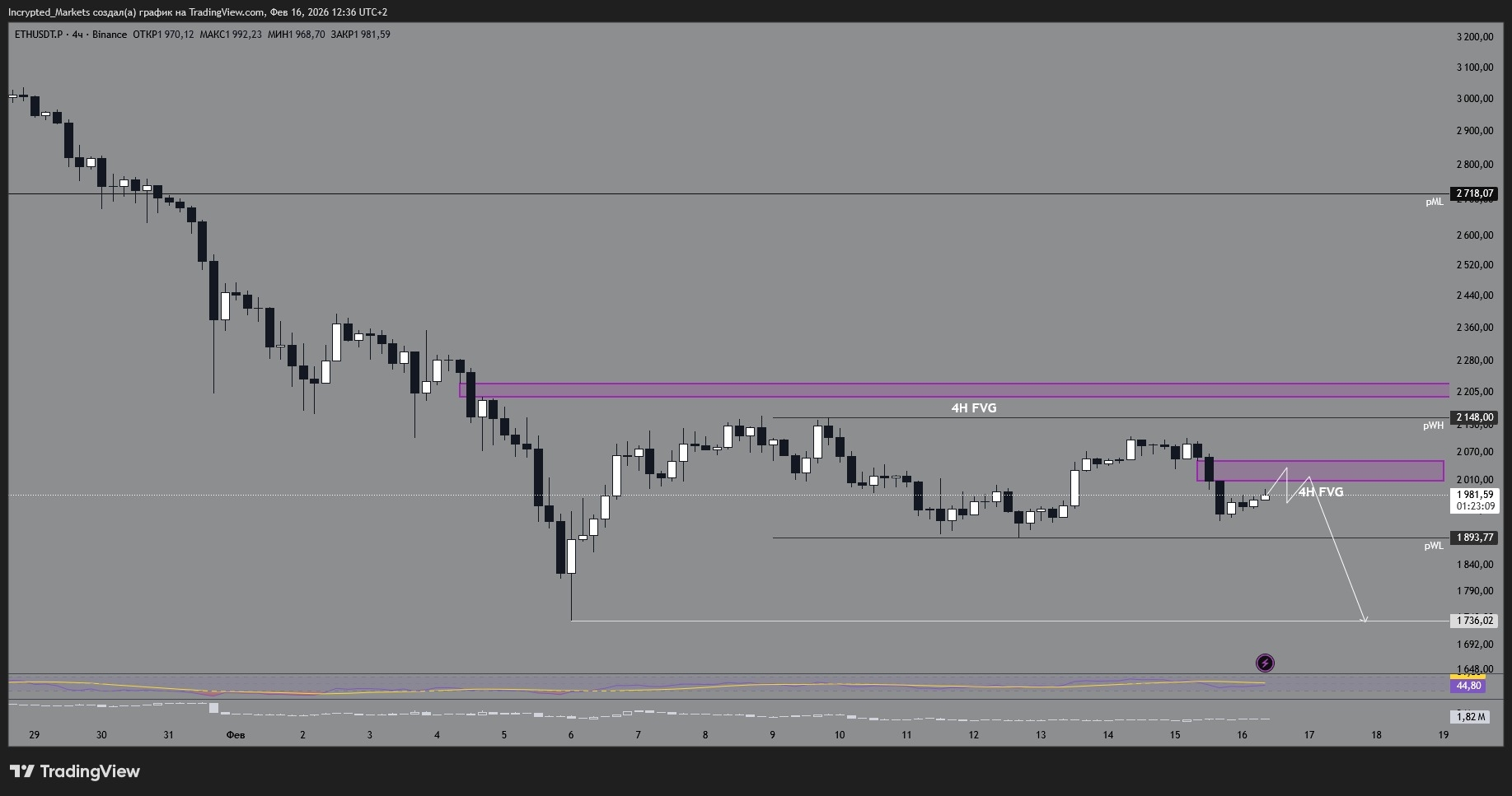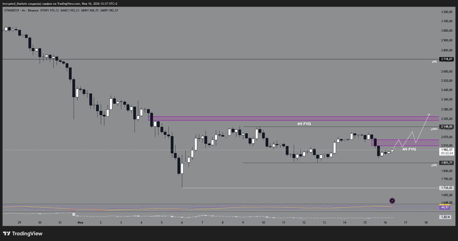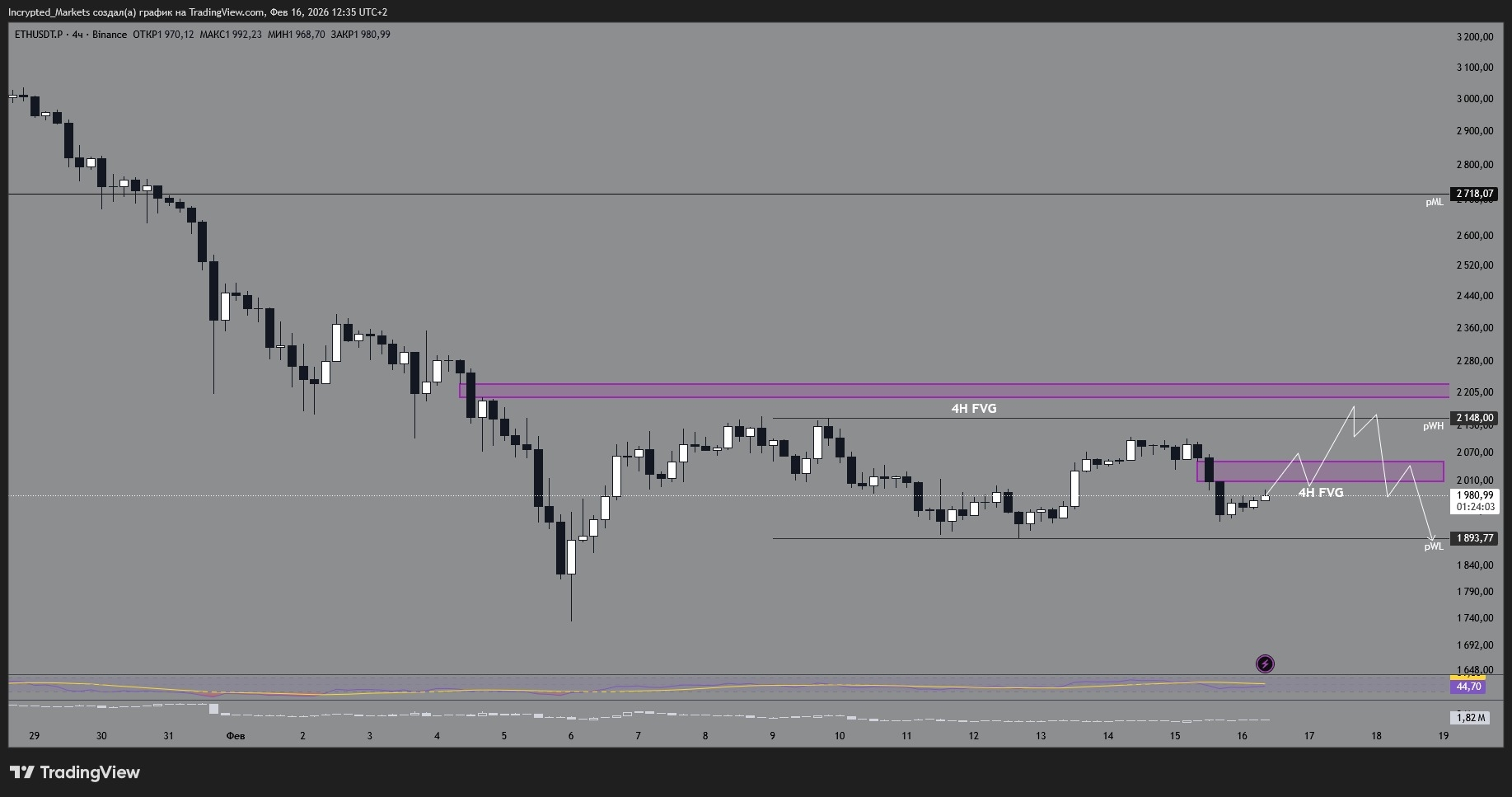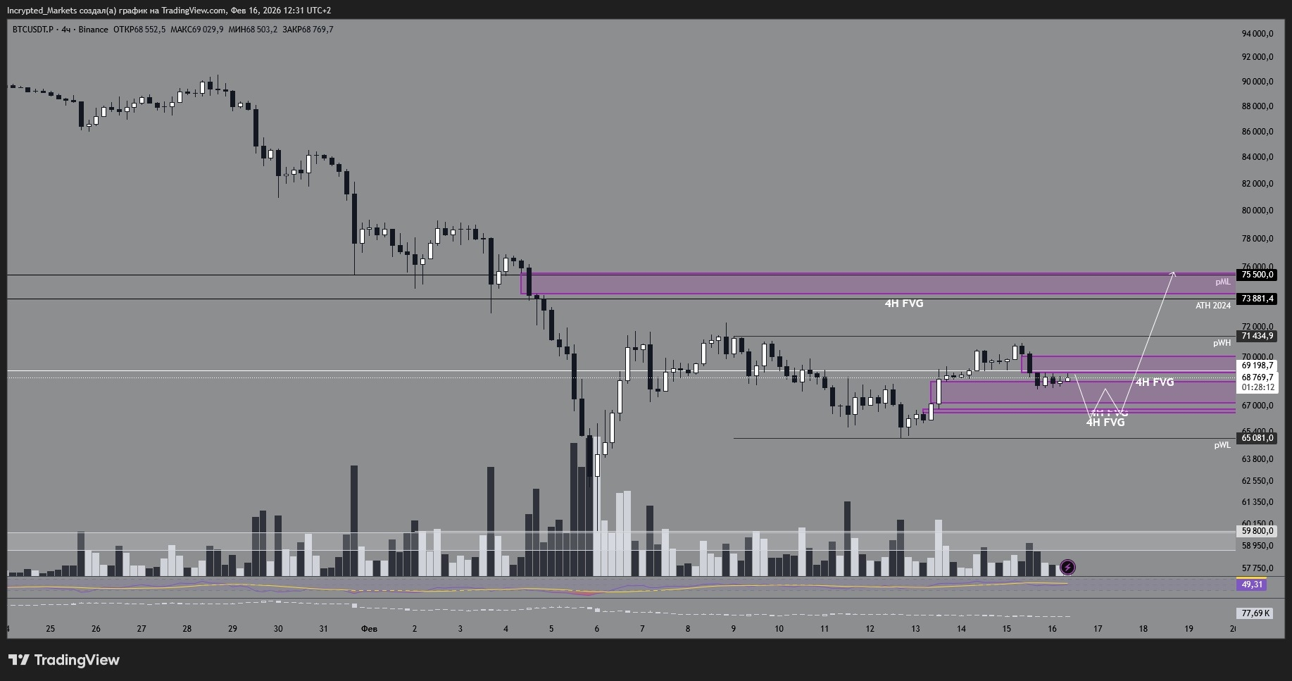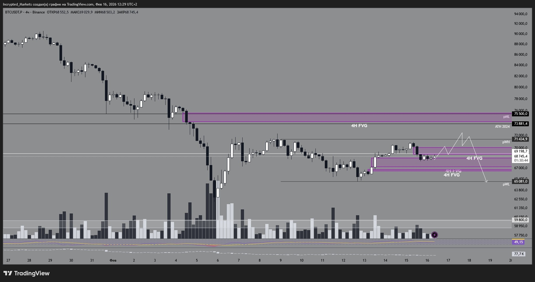 Тиждень починаємо з конструктиву: біткоїн ідеально відпрацював FVG на годинці та сформував чіткий робочий діапазон $65 000 – $72 000. Структура є, але радіти рано — ліквідність анемічна, великого покупця "Buy All" не видно.