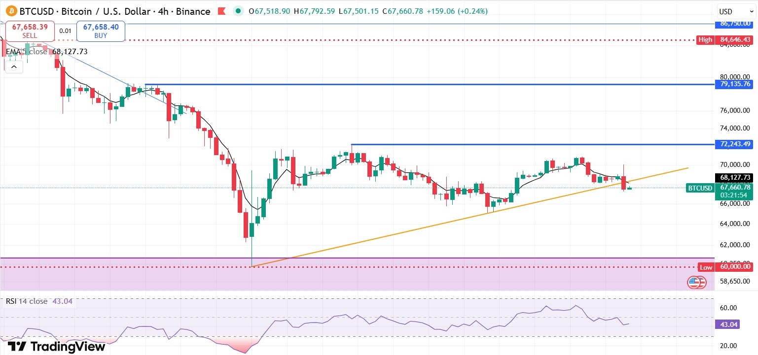 Bitcoin is currently trading in the high price around $67k–$69k after failing to hold above the key $72,200 resistance level.