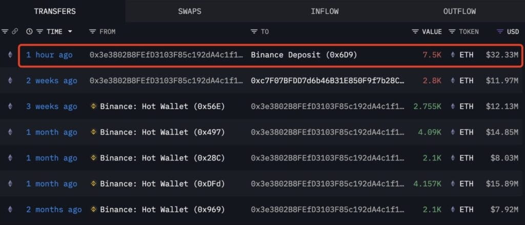 In letzter Zeit entwickelt sich der Preis von Ethereum (ETH) stabil, aber die Verkaufsaktivitäten von großen Investoren (Walen) sorgen für viele Sorgen auf dem Markt. Laut Informationen von Lookonchain hat eine berühmte Wal-Wallet mit der Adresse 0x3e38 gerade einen Verkauf von 7.500 ETH, im Wert von etwa 32,33 Millionen USD, an der Börse Binance durchgeführt. Trotz des großflächigen Verkaufs hält diese Wallet weiterhin 7.702 ETH (entspricht etwa 33 Millionen USD). Im Zeitraum vom 20.7. bis 12.8. hat diese Wallet insgesamt 15.202 ETH zu einem Durchschnittspreis von 3.869 USD abgehoben, was zeigt, dass der Wal versucht, Gewinne zu realisieren, während der ETH-Preis nicht viele Schwankungen aufweist.