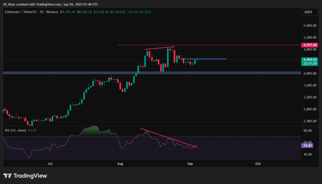 Ein bemerkenswerter Aspekt ist, dass der Preis oft stark ansteigt, sobald der RSI durchbricht. Derzeit nähert sich ETH einer wichtigen Widerstandsstufe bei 4.500 USD. Wenn Ethereum diese Widerstandslinie überwinden kann, ist es wahrscheinlich, dass der Preis auf das historische Hoch von 4.957 USD zusteuert.