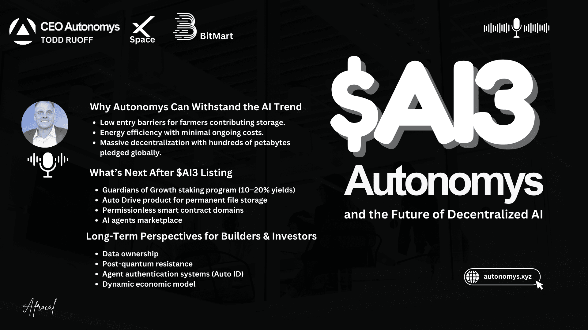Unser Fokus heute liegt darauf, #AutonomysNetwork zu setzen, um zukünftige Möglichkeiten mit AI3.0 zu bringen.