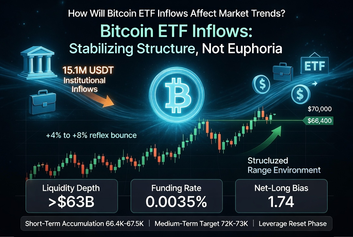 Verbesserte Liquidität verringert auch kaskadierende Liquidationen während Rückgängen. Anstelle aggressiver Wicks beginnt der Markt, engere Spannen mit klareren strukturellen Niveaus zu bilden. Dies schafft ein kontrolliertes Handelsumfeld zwischen 66.400 und 70.000 USDT. Die Bewegung wird eher ein gemessener Rückprall als ein vertikaler Durchbruch sein.