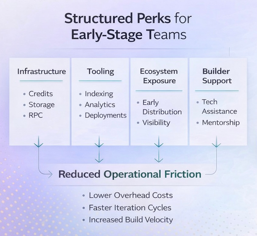 What I found wasn’t a grant announcement or a token farming campaign. It was a categorized perks system built around lowering operational friction for early-stage teams.