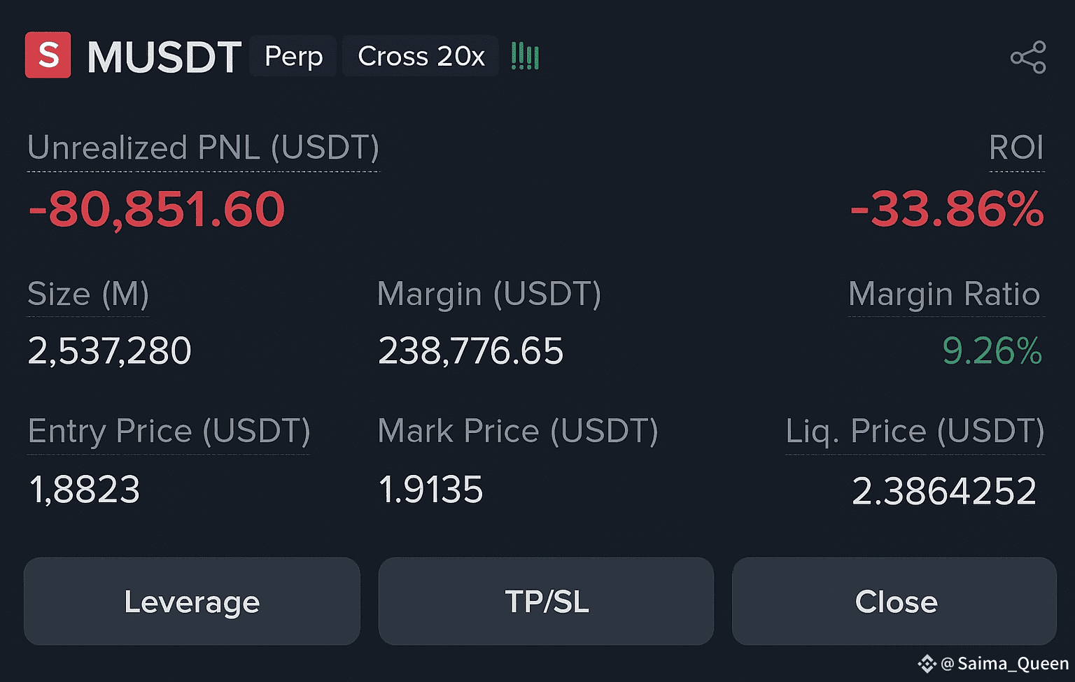 Größe: 2.537.280 MUSDT mit 20x Hebel ist extrem hoch für die Margin (238.776 USDT).