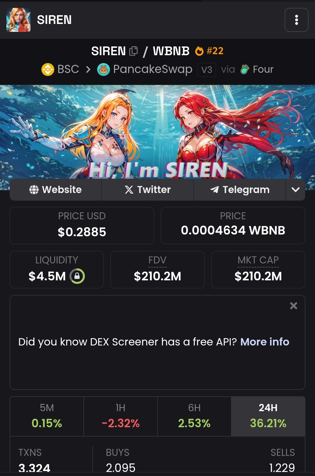 Auf Sol gibt es AI-Token wie Ai16z und Goat, während auf BSC $Siren kontinuierliche Preiserhöhungen und starken Rückhalt durch großen Kaufdruck erlebt, was auf einen starken Aufwärtstrend hinweist, nicht auf ein Pump-and-Dump-Szenario. BSC drängt auf AI, und Sirens Konto war selbst in einem Bärenmarkt aktiv. Das letzte Mal war es #aia, das nächste war #river, wird Siren diesmal der nächste Hauptcharakter auf BSC sein?