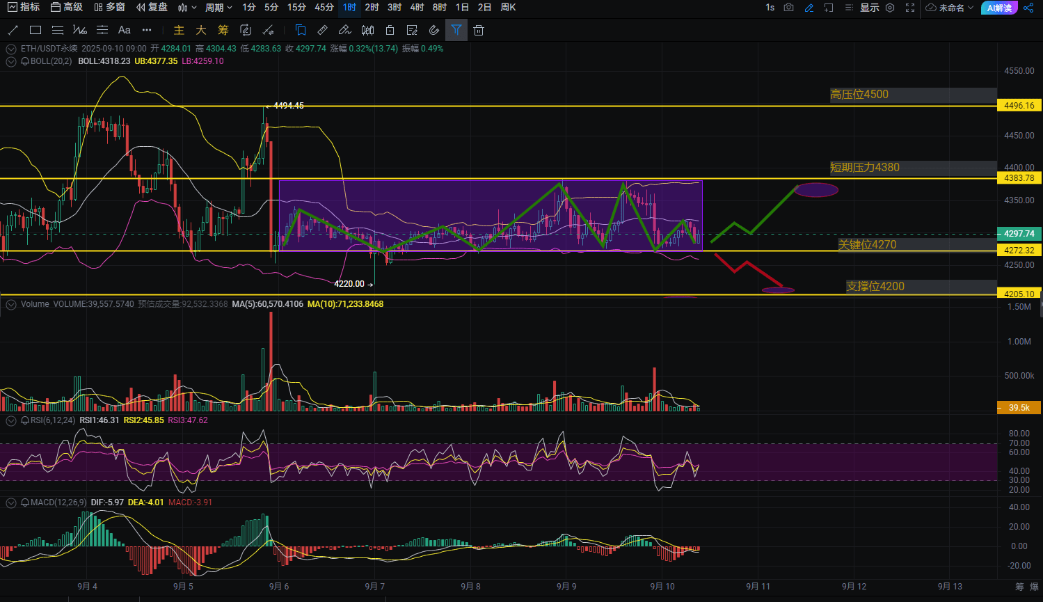 Basierend auf der aktuellen Marktlage und der technischen Analyse denke ich, dass ETH heute wahrscheinlich im Bereich von 4270 - 4380 schwanken wird.