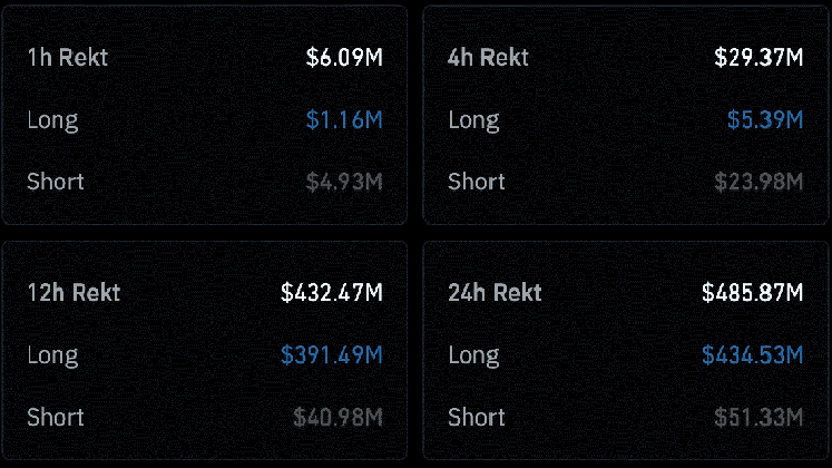 • Bitcoin holds above $66,000 but remains under pressure as total crypto liquidations near $500 million over the past 24 hours.
