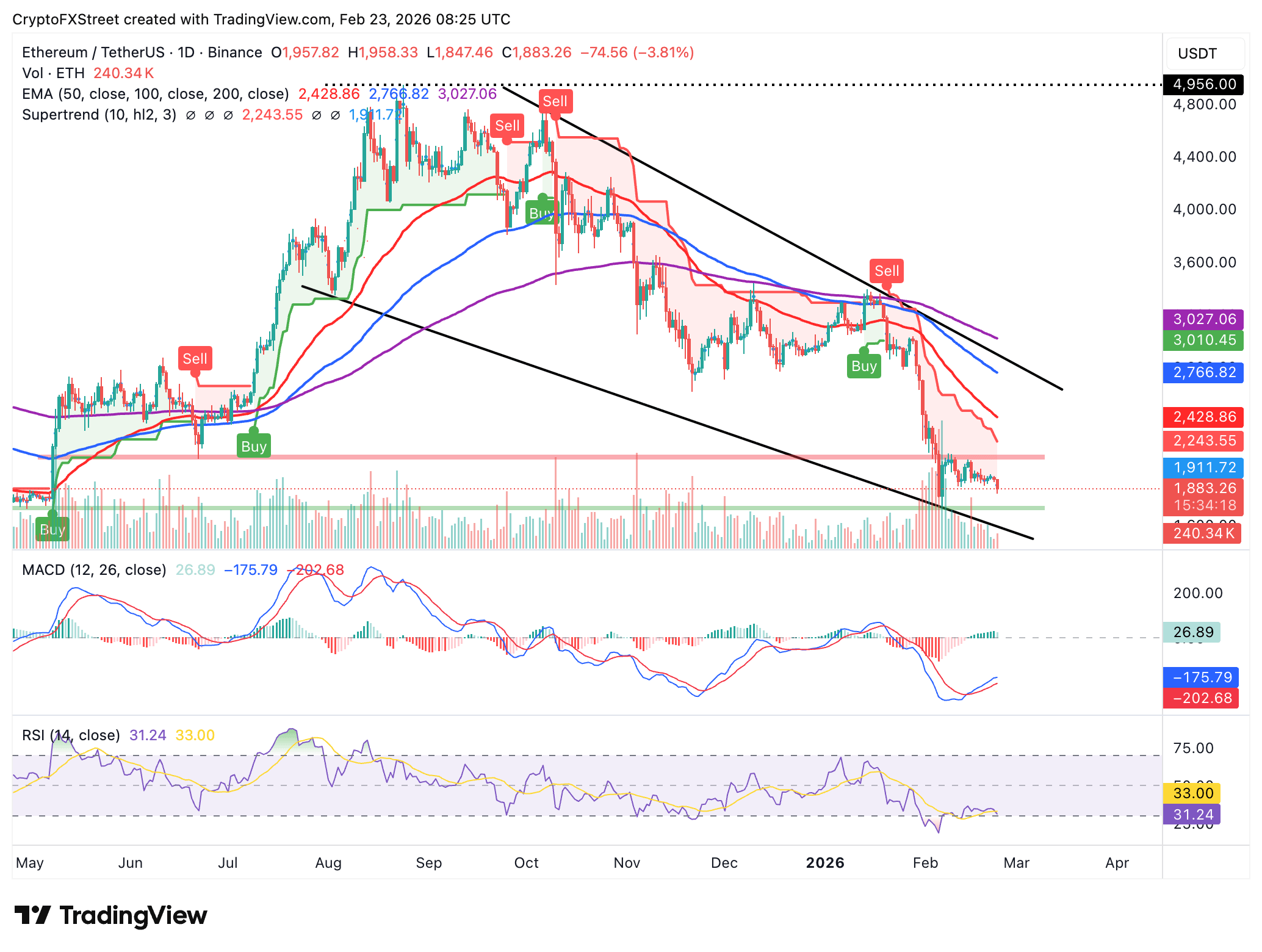 The RSI indicator at 33 is sliding toward oversold territory, a scenario that could escalate the prevailing bearish momentum. Below the intraday low, Ethereum may stretch the downtrend to the February 6 low of $1,748.