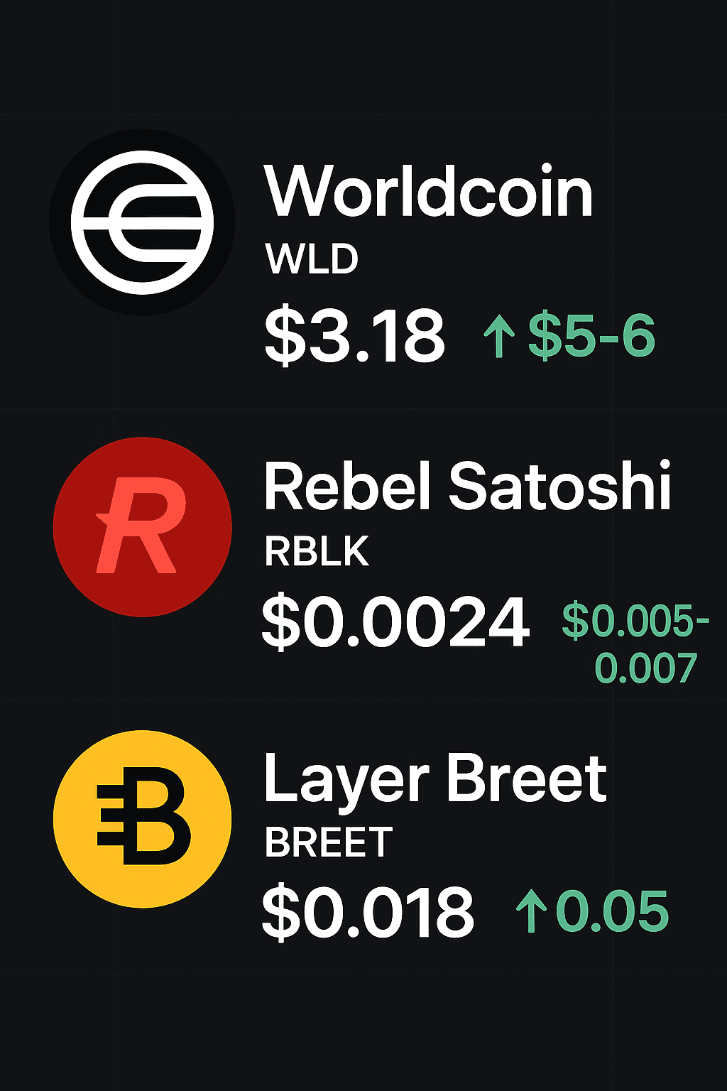 Der Kryptomarkt schlĂ€ft nie â und gerade jetzt ziehen drei einzigartige MĂŒnzen Aufmerksamkeit auf sich: Worldcoin (WLD), Rebel Satoshi (RBLK) und Layer Breet (BREET). Lass uns aufschlĂŒsseln, warum diese Tokens 2025 im Trend liegen könnten đ
