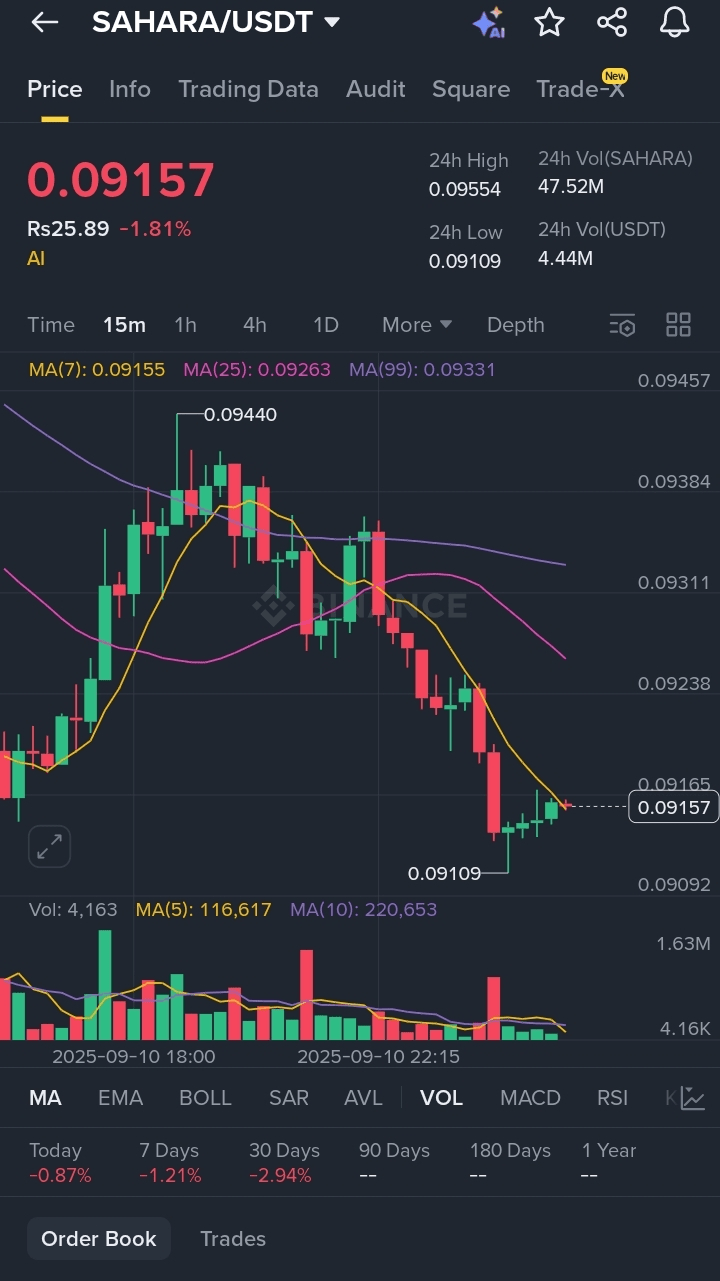Hey Trader! Heute tauchen wir in den AI-Krypto-Wahnsinn ein, lassen Sie uns Sahara AI (SAHARA) ins Rampenlicht rücken, das Token, das eine Full-Stack, AI-native Blockchain antreibt, die alles über die Demokratisierung der AI-Entwicklung geht. SAHARA wird bei etwa $0.092 gehandelt, was einem Rückgang von etwa 7% in den letzten 24 Stunden angesichts breiterer Marktsorgen entspricht, aber mit einem soliden Handelsvolumen von über $52M zeigt, dass das Interesse nicht nachlässt. Dieses Token hat sich nach einer wilden Fahrt konsolidiert – ATH bei $0.163 im Juli, jetzt findet es Fuß in einem absteigenden Kanal. Mit einem neutralen RSI (rund 50-60), MACD, der auf einen bullischen Crossover hindeutet, und dem jüngsten X-Geschwätz über Ausbrüche über $0.097, fühlt sich das Setup reif für einen kurzfristigen Sprung an, wenn Alts von der Stabilität von Bitcoin etwas Liebe bekommen. Es ist extrem volatil im AI-Sektor, aber die Grundlagen – wie der Start der Data Services Platform, die den Nutzen steigert – könnten einen schnellen Anstieg von 5-15% in den nächsten 24-72 Stunden anheizen. DYOR, handeln Sie clever und denken Sie daran: das ist keine Finanzberatung, sondern das Lesen der Charts mit einem menschlichen Touch.