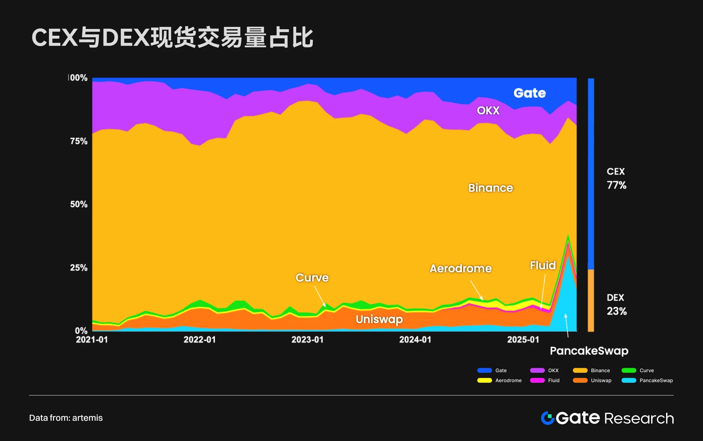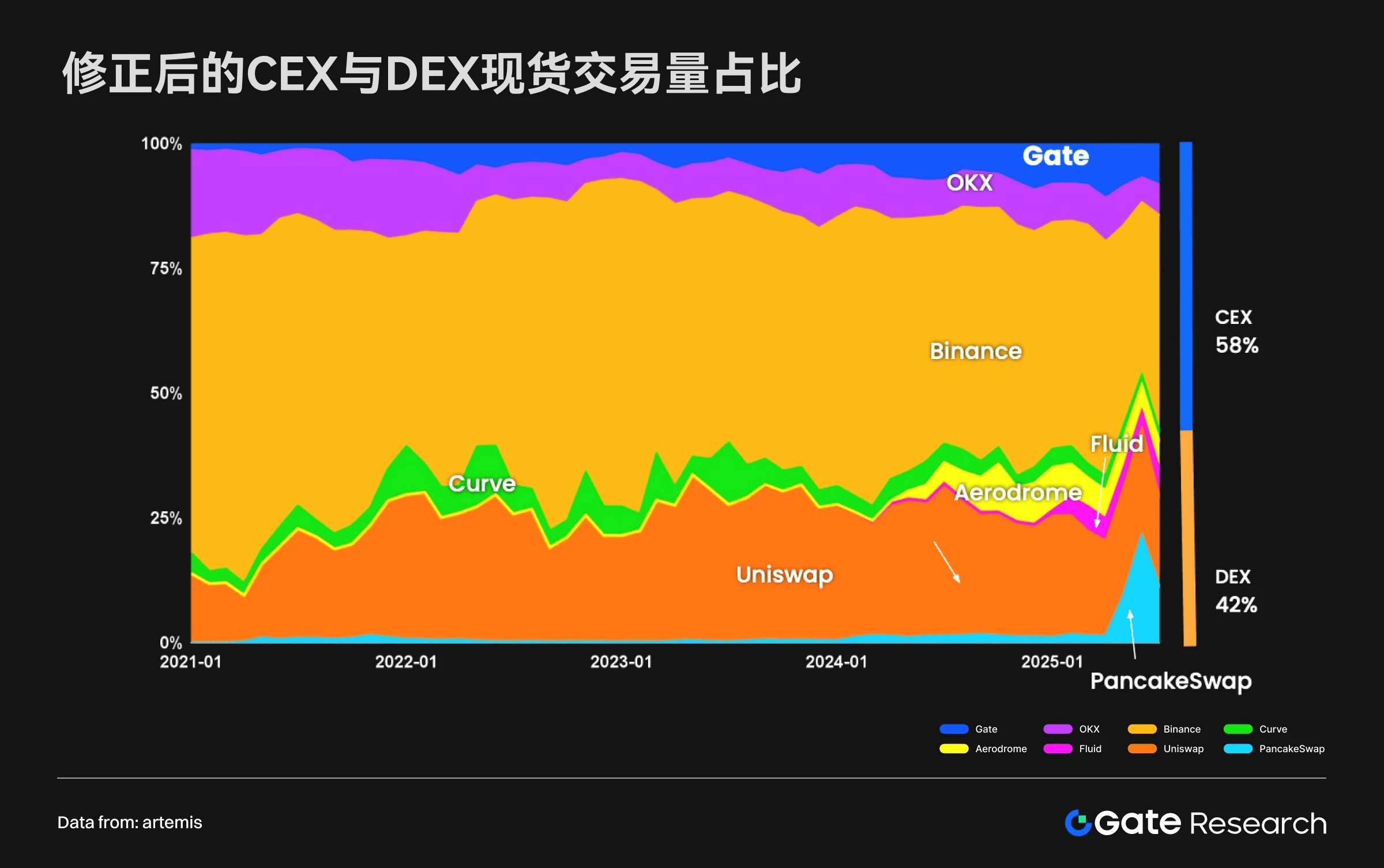 Derzeit machen CEX etwa 77 % des globalen Spot-Handelsvolumens aus, während DEX etwa 23 % ausmacht. Wenn jedoch der Einfluss von Wash Trading ausgeschlossen wird, zeigen die Daten, die die tatsächliche Aktivität im Einzelhandelsmarkt widerspiegeln: CEX macht 58 % aus, während DEX 42 % ausmacht. Dies bedeutet, dass DEX beim tatsächlichen, benutzergetriebenen Handel bereits nahe an CEX heranrückt und ein schnelles Aufholen zeigt.