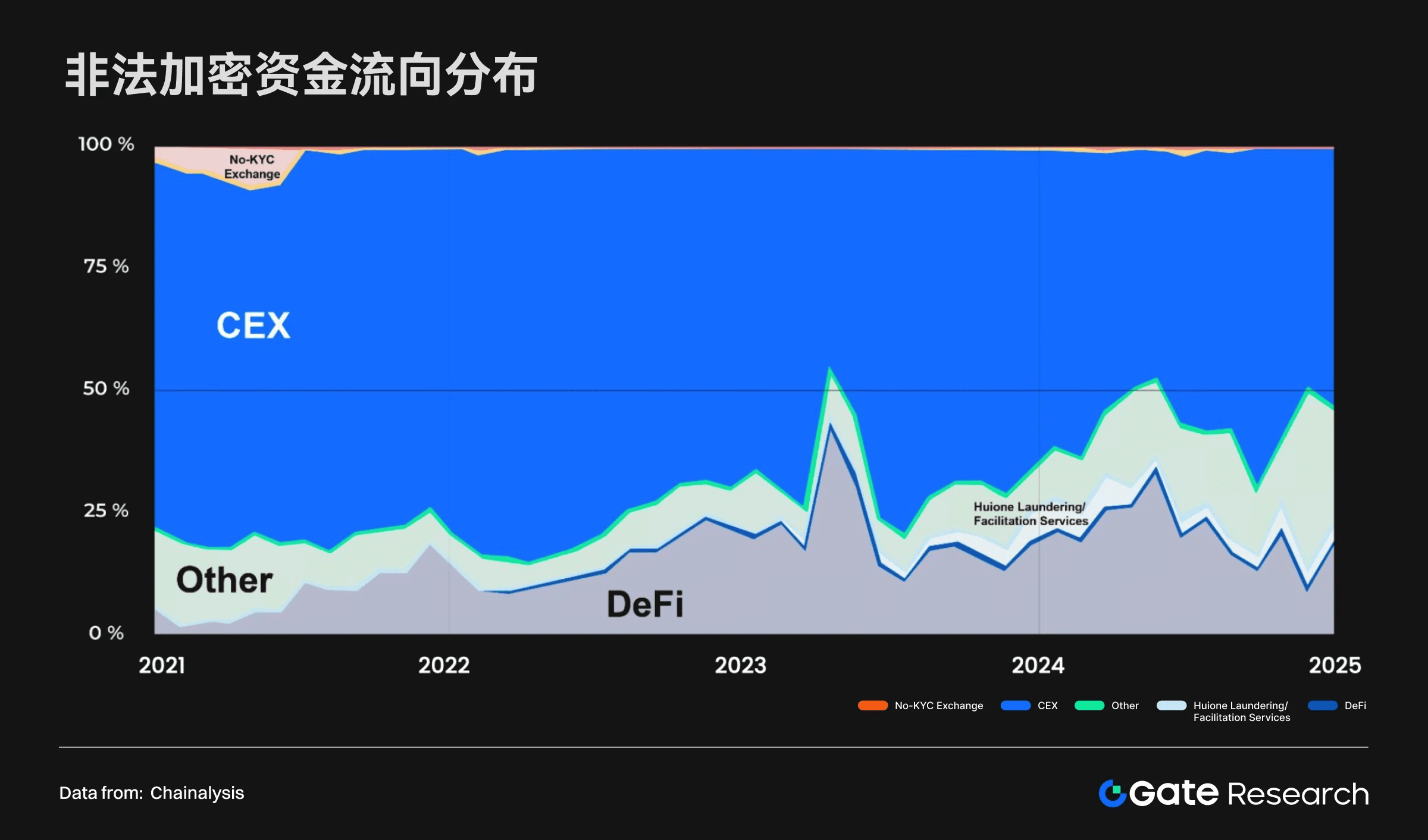 Im Vergleich dazu weist das Betriebsmodell von DEX signifikante Unterschiede auf. Aufgrund des Mangels an zentralisierten juristischen Personen und eines einheitlichen grenzüberschreitenden Regulierungsrahmens haben die meisten DEX keine verbindlichen Compliance-Mechanismen etabliert und führen in der Regel keine KYC- oder Identitätsüberprüfungen durch. Diese Offenheit und Anonymität bieten den Nutzern zwar mehr Freiheit, schaffen jedoch auch eine klare Lücke im AML-Risikomanagement. Daten zeigen, dass der Anteil illegaler Gelder im DEX von Jahr zu Jahr steigt, insbesondere in Phasen hoher Marktvolatilität, wodurch DEX leichter zu einem wichtigen Kanal für Betrug und Hacker-Gelder wird. Daher ist Compliance nicht nur die institutionelle Basis für die Differenzierung der Branche, sondern wird auch ein entscheidender Faktor für die zukünftige Entwicklung des Marktumfelds sein.