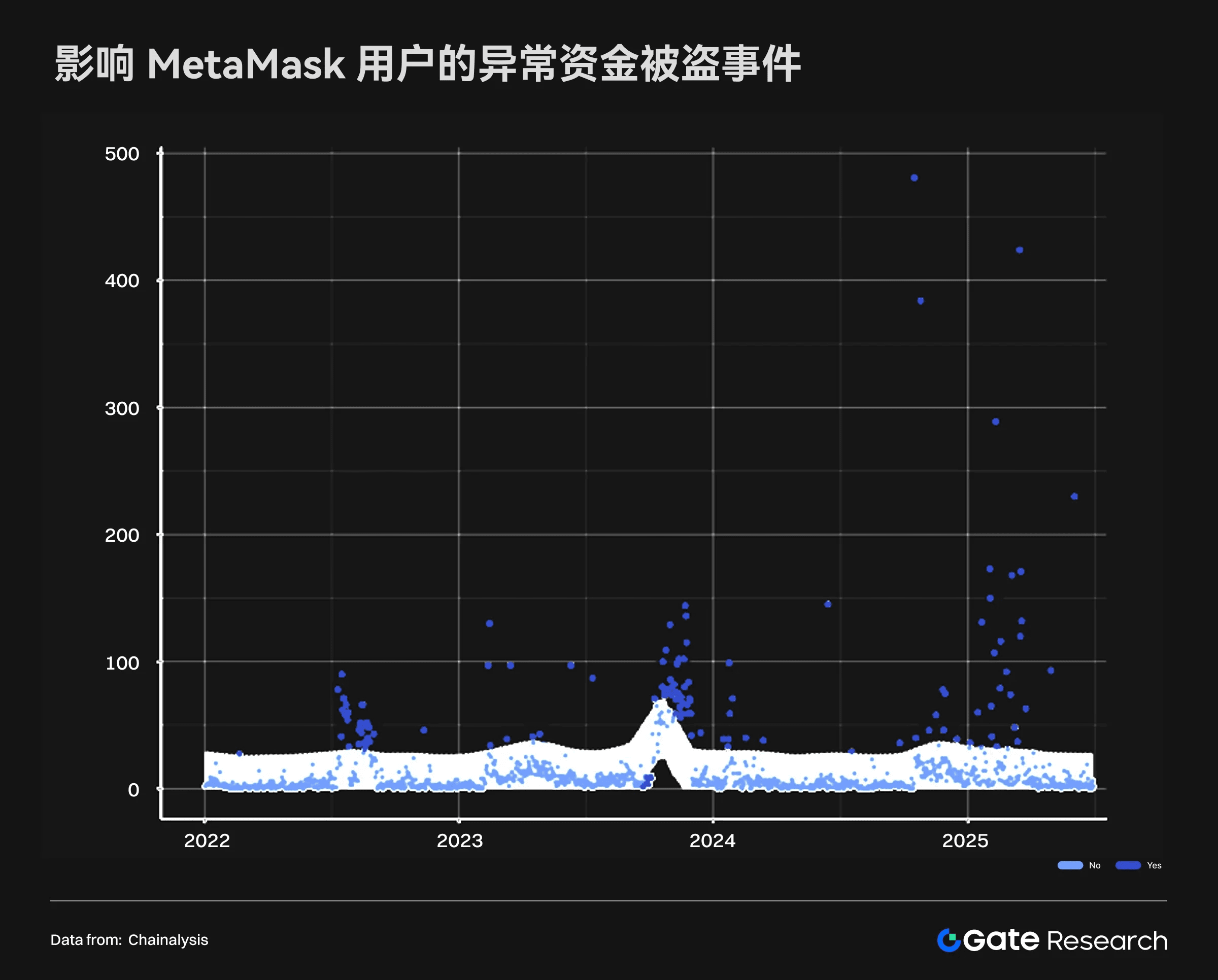 Vor dem Hintergrund zunehmender Angriffe auf persönliche Wallets ist MetaMask zu einem der repräsentativsten Fälle geworden. Seit Ende 2024 sind die Fälle von gestohlenem Geld bei MetaMask-Nutzern deutlich gestiegen und setzen sich auch im Jahr 2025 fort. Einige Angriffe haben an einem einzigen Tag fast 500 Wallets betroffen, was zeigt, dass Hacker in der Lage sind, systematische Methoden gegen große Nutzergruppen einzusetzen. Im Vergleich dazu gab es Mitte 2022 und Ende 2023 zwar auch sporadische Spitzen, aber deren Frequenz und Schweregrad lagen weit unter dem aktuellen Niveau, was auf eine Evolution des Bedrohungsmodells hinweist.