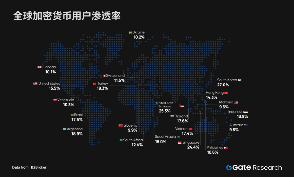 • Hohe Durchdringung: Südkorea (27 %), VAE (25,3 %), Singapur (24,4 %), Türkei (19,3 %), was zeigt, dass Kryptotechnologie in diesen Märkten hochgradig verbreitet ist. Hochdurchdrungene Märkte