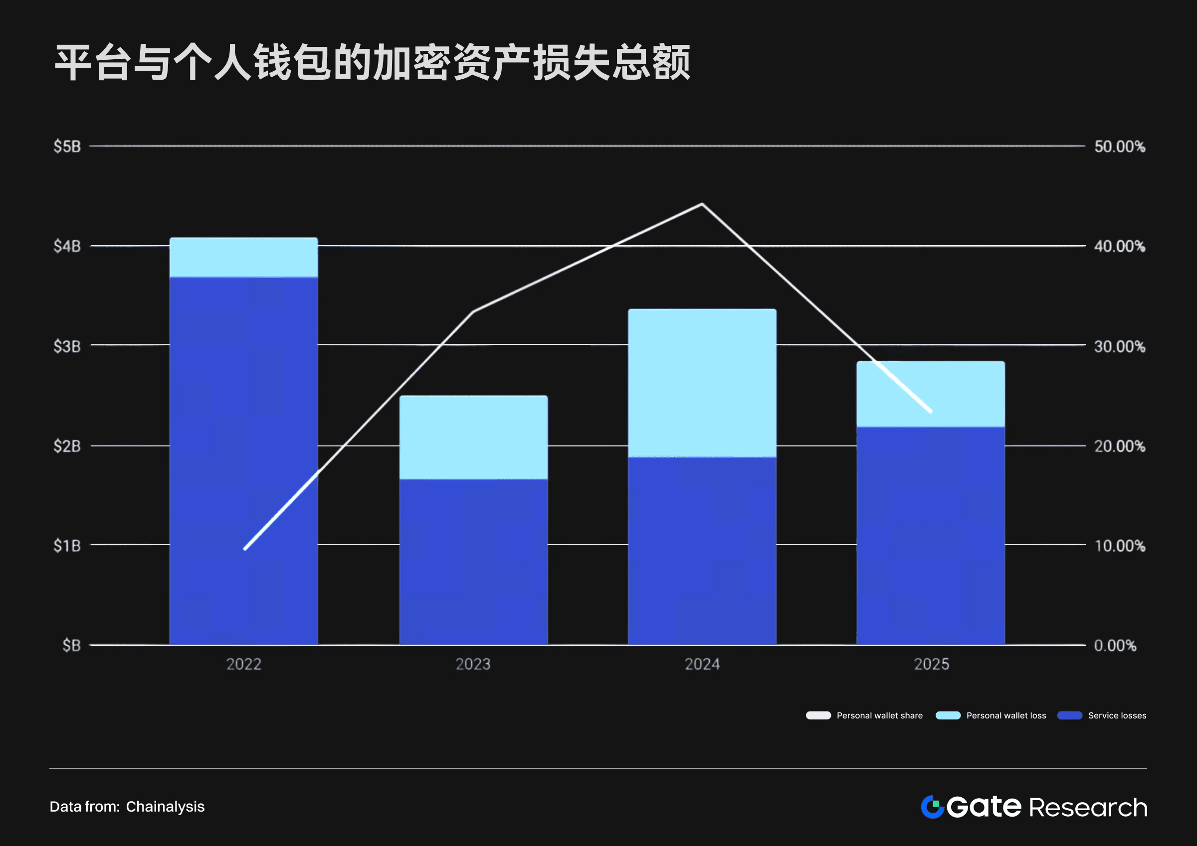 Von 2023 bis 2025 sieht sich der Kryptobereich einer Reihe von großangelegten Diebstählen gegenüber. Laut Daten von Chainalysis stammen etwa 59 % der gestohlenen Vermögenswerte aus DEX/Web 3-Protokollen, mit einem Verlustbetrag von bis zu 5,9 Milliarden US-Dollar, was die Sicherheitsmängel dezentraler Systeme unterstreicht. Die Hauptangriffsarten sind Smart-Contract-Sicherheitslücken, Sicherheitsausfälle bei Cross-Chain-Brücken und Designfehler in der Governance, was bedeutet, dass Web 3 ein höheres Risiko in Bezug auf die Sicherheit von Geldern trägt. Im Vergleich dazu hat CEX zwar ebenfalls zentrale Risiken, aber aufgrund seines relativ ausgereiften Sicherheitssystems ist der Anteil der finanziellen Verluste geringer.
