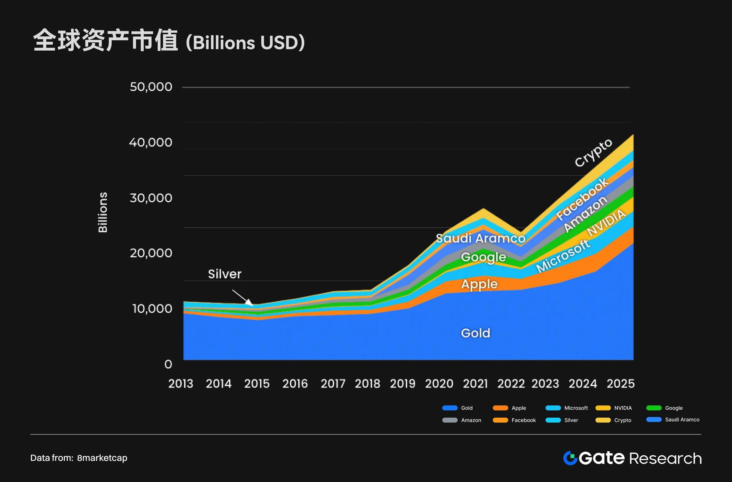 In nur drei Jahren hat sich jedoch eine massive Veränderung vollzogen. Bis August 2025, angetrieben von der Welle der künstlichen Intelligenz und dem Krypto-Bullenmarkt, wurde das globale Vermögensbild vollständig umgeschrieben. Der Marktwert von Gold stieg auf 22,93 Billionen US-Dollar; Nvidia, gestützt durch seine Führungsposition im AI-Bereich, erreichte einen Marktwert von 4,24 Billionen US-Dollar. In dieser Zeit hat sich das Krypto-Vermögen besonders glänzend entwickelt, mit einer Gesamtmarktkapitalisierung von 3,02 Billionen US-Dollar, die historisch Silber und Amazon übersteigt und damit offiziell in die Reihe der wichtigsten globalen Vermögenswerte aufsteigt.