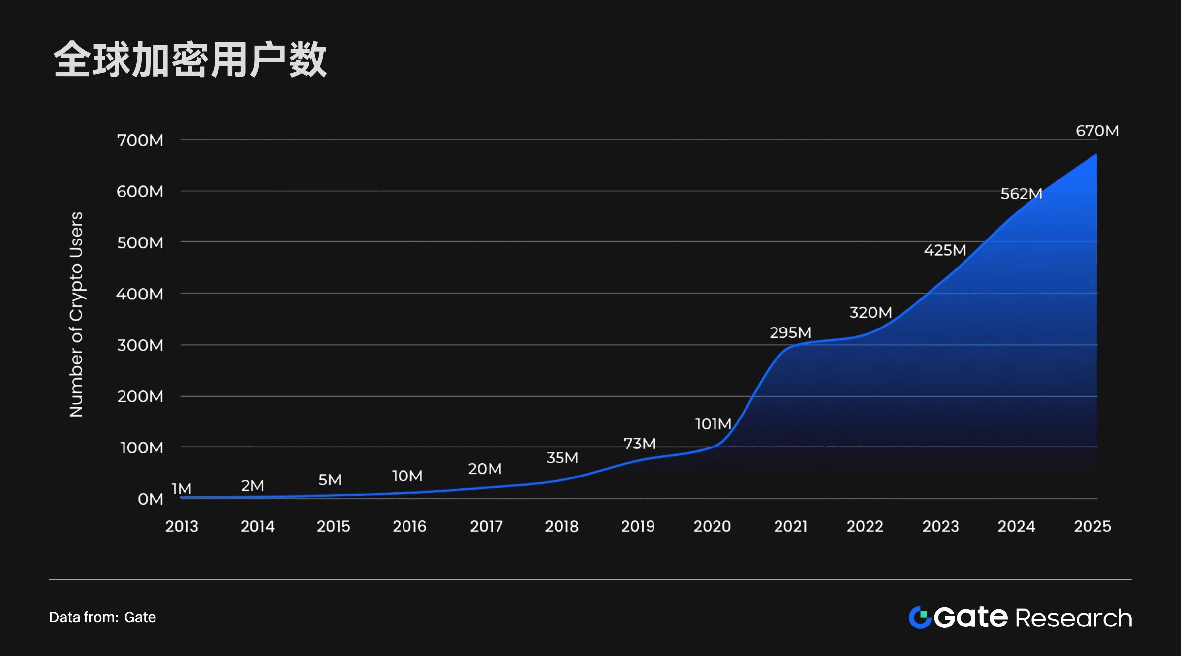 Basierend auf den Daten zu Krypto-Durchdringung, Wachstums-trends, Marktleistungen und Prognosen von Demandsafe zeigt sich, dass die globale Nutzeranzahl im Kryptobereich in den letzten zehn Jahren exponentiell gewachsen ist. Die Nutzerzahl stieg von etwa 1 Million im Jahr 2013 auf 670 Millionen im Jahr 2025, mit einer äußerst bemerkenswerten jährlichen Wachstumsrate. Insbesondere nach 2020 beschleunigte sich die Nutzerkurve plötzlich, was darauf hindeutet, dass der Kryptomarkt von frühen Experimenten zu einer breiten Akzeptanz übergeht.