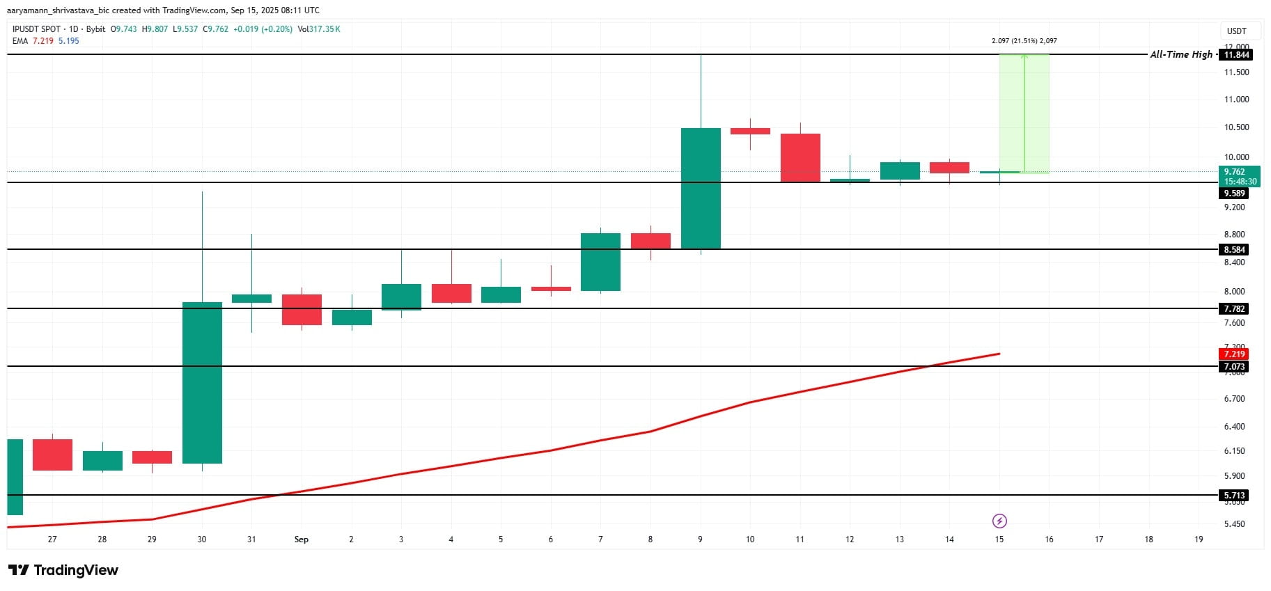 Der langsamste, aber mit Fundament. Der Kurs hält sich über $9.58, ATH bei $11.84. Die EMA-50 liegt unter den Kerzen – ein bullischer Signal. Wenn IP $12 durchbricht, wird das nicht nur ein Anstieg sein, sondern eine Wiederherstellung des Vertrauens in narrative Tokens.