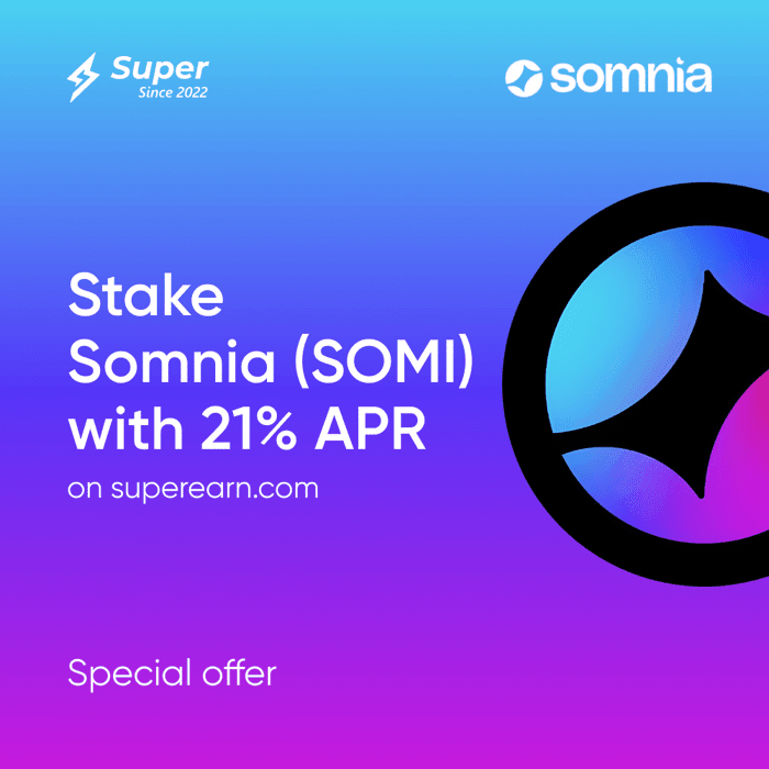 Das Staking des Somnia-Netzwerks (SOMI) auf Super mit 21% APR ist eine effektive Möglichkeit, passives Einkommen zu erzielen und gleichzeitig an einem der ehrgeizigsten Metaverse-Projekte in Web3 teilzunehmen.
