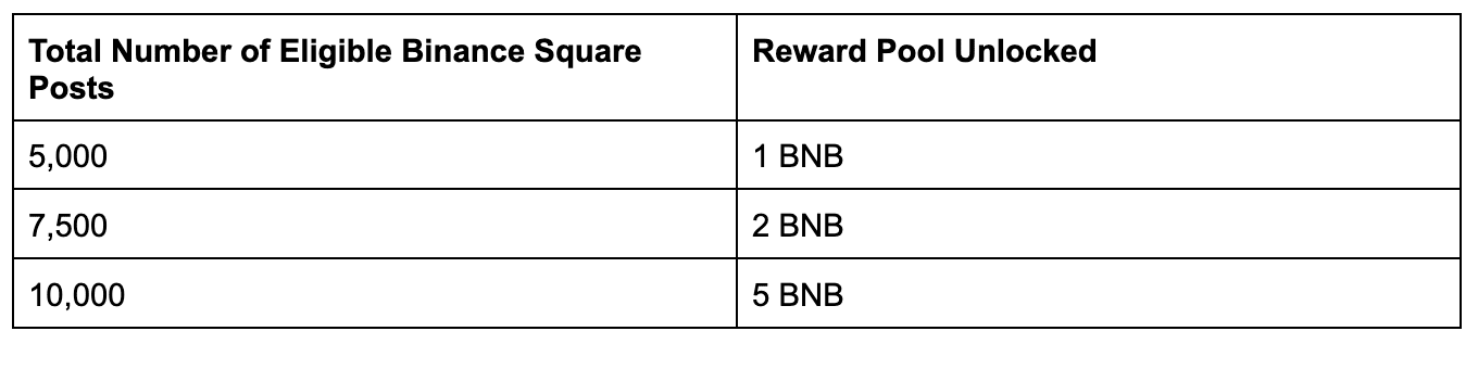 Der endgültige Belohnungspool wird durch die Gesamtzahl der berechtigten Binance Square-Beiträge bestimmt, die während des Aktivitätszeitraums eingereicht wurden, gemäß der Tabelle unten.