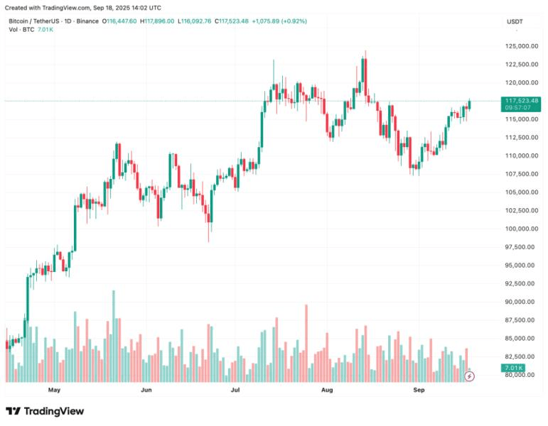 Am Freitag (19. September) während der asiatischen Handelsstunden setzte Bitcoin seine Konsolidierung über 117.000 US-Dollar fort, nachdem die Federal Reserve eine Zinssenkung angekündigt hatte. Bitcoin befindet sich weiterhin in einem empfindlichen Gleichgewicht, wobei die 115.200 US-Dollar-Marke als entscheidend für die nächste Bewegung angesehen wird.