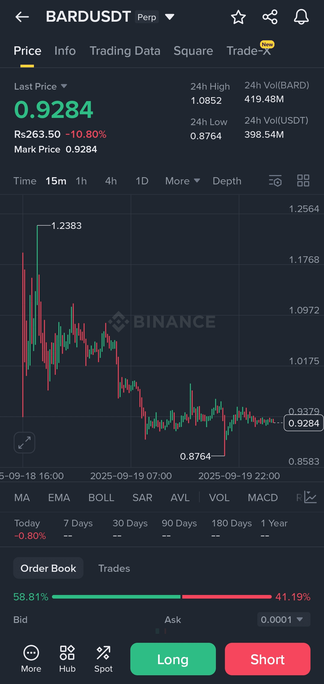 Der letzte Preis ist identisch mit dem Markpreis bei 0.9284, was auf eine sofortige Diskrepanz im Finanzierungszinssatz hinweist. Das Diagramm zeigt einen steilen Rückgang von höheren Niveaus, wobei der aktuelle Preis nahe der unteren Grenze seiner jüngsten Spanne liegt. Ein Blick in das Orderbuch zeigt ein bemerkenswertes Ungleichgewicht, wobei Verkaufsaufträge (asks) mit 58.81% dominieren im Vergleich zu Kaufaufträgen (bids) mit 41.19%. Diese Struktur deutet darauf hin, dass der Verkaufsdruck die Nachfrage auf den aktuellen Niveaus überwältigt. Der niedrigste sichtbare ask liegt bei 0.9379, während das höchste bid mit 0.9284 niedriger ist, was den sofortigen Abwärtsdruck bestätigt.