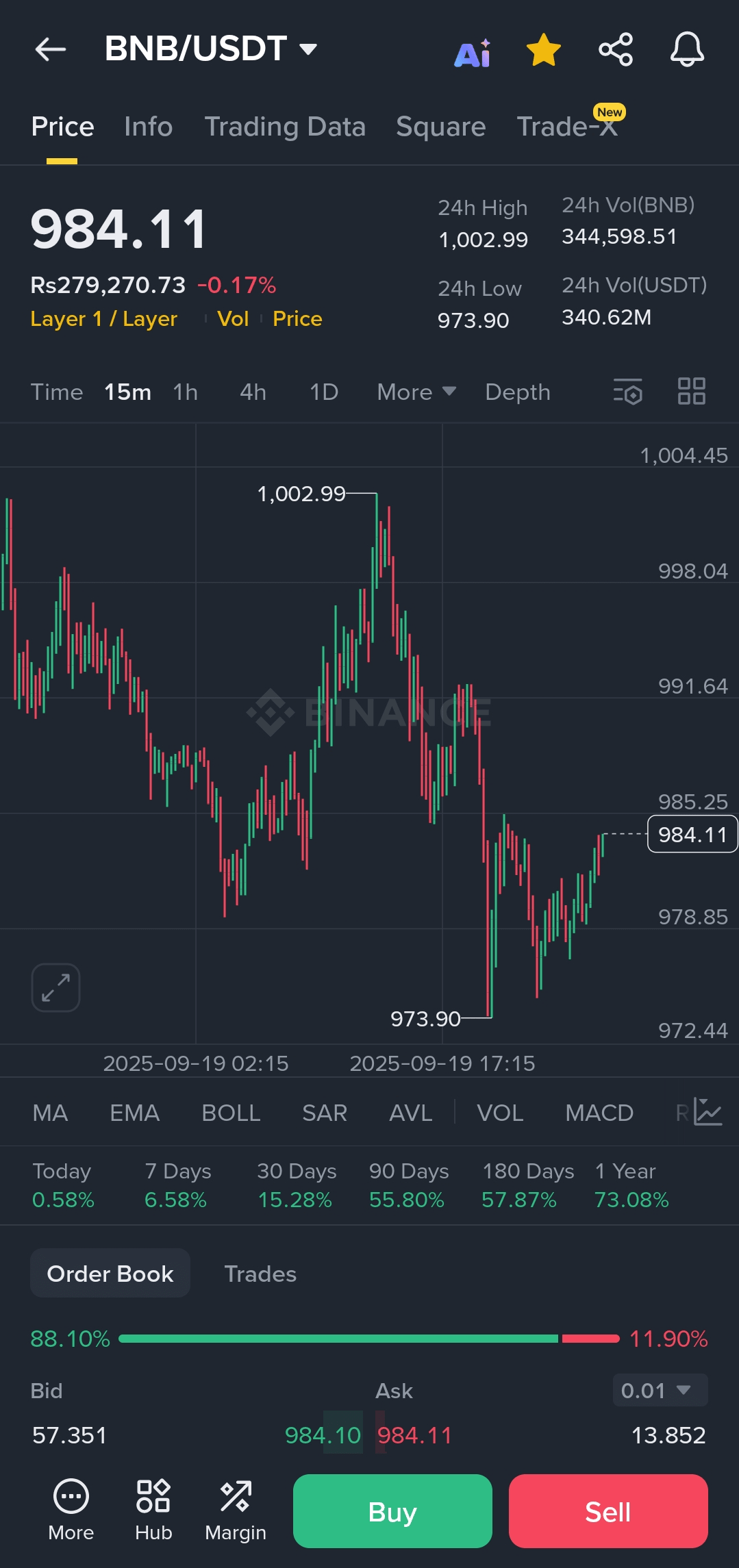 BNB wird derzeit bei 984,11 USD gehandelt, was einen leichten täglichen Rückgang von -0,17% widerspiegelt. Die Kryptowährung verzeichnete ein 24-Stunden-Hoch von 1.002,99 USD und ein Tief von 973,90 USD, was auf eine moderate Volatilität innerhalb des Tages hinweist.