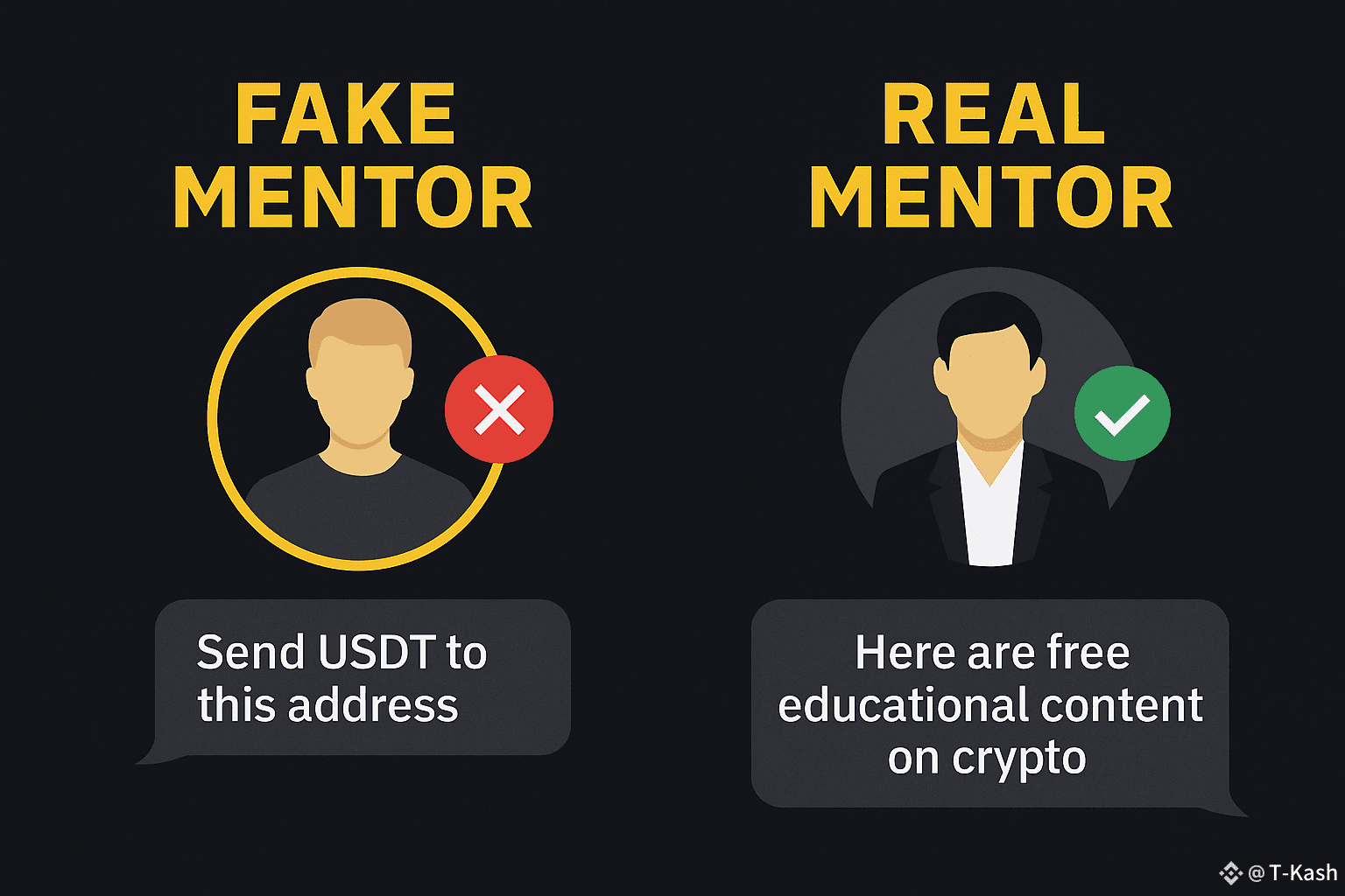 On one side: “Fake Mentor” (red X) asking for money in DM.