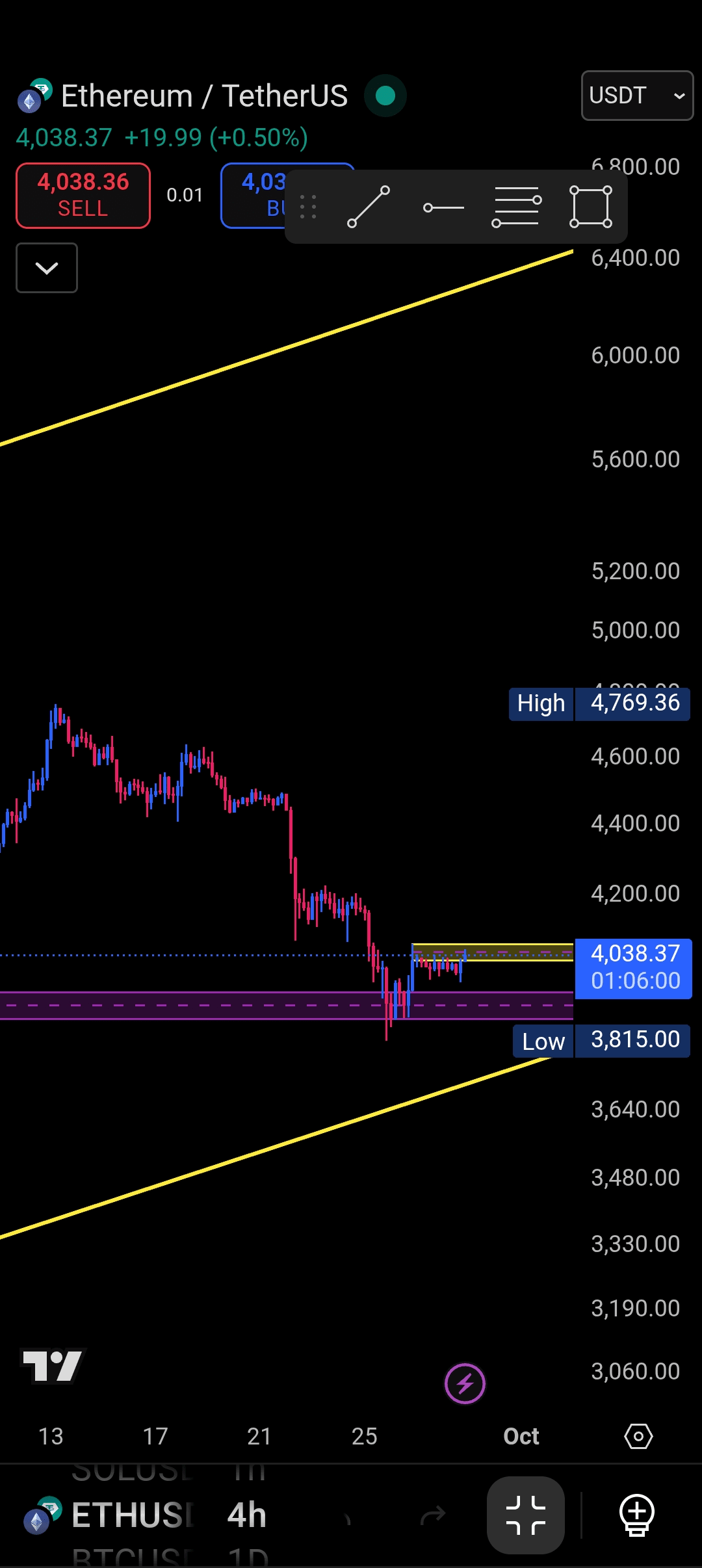 Wenn eine 4-Stunden-Kerze grün im gelben Kanal schließt und erfolgreich zurücktestet, könnte der Preis kurzfristig auf $4200 steigen. Öffne jedoch keine große Long-Position, da die Wahrscheinlichkeit hoch ist, dass Ethereum $3800 erneut testet, bevor es wieder nach oben geht.