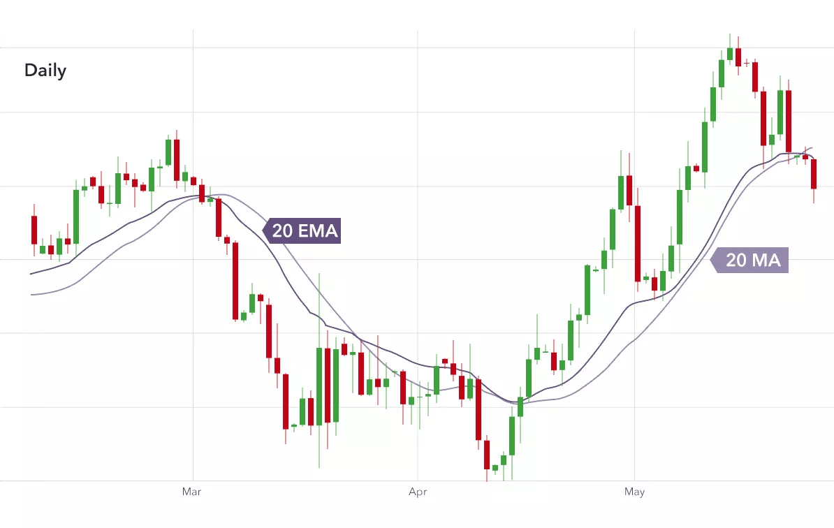 Der exponentielle gleitende Durchschnitt funktioniert im Wesentlichen auf die gleiche Weise wie der einfache gleitende Durchschnitt, außer dass er den neueren Perioden mehr Gewicht verleiht. Das bedeutet, dass der EMA schneller auf Preisbewegungen reagiert und tendenziell den zugrunde liegenden Preis näher folgt als der entsprechende MA. Lassen Sie uns ansehen, wie der 20 EMA im Vergleich zum 20 MA in einem täglichen GBP/USD-Diagramm aussieht: