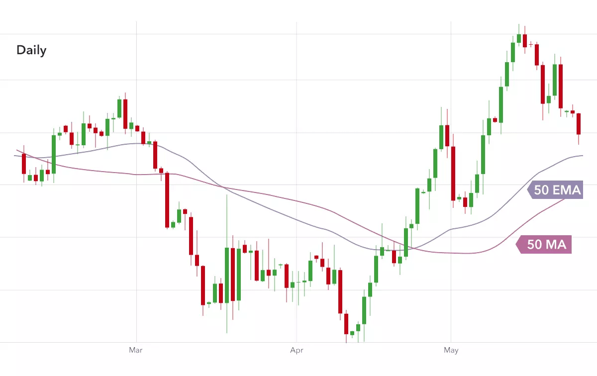 Wegen der Art und Weise, wie sie berechnet wird, ist der EMA empfindlicher gegenüber Preisspitzen in jüngeren Perioden, aber weniger empfindlich gegenüber Preisspitzen in weiter zurückliegenden Perioden. Dies kann nützliche Informationen sein, wenn man gleitende Durchschnitte zum Handel verwendet, wie wir im nächsten Abschnitt sehen werden.