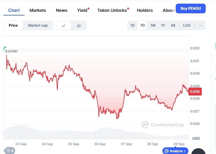 Mit einem Live-Preis von 0,028573 $ und einem erstaunlichen Handelsvolumen von 187.549.272 $, hat dieses Projekt sowohl Aufregung als auch Vorsicht ausgelöst. In den letzten 7 Tagen hat der Token einen Rückgang von 10,93 % verzeichnet, was Händler darüber nachdenken lässt, ob dieser Rückgang eine Chance zum Kauf oder ein Warnsignal für weitere Verluste ist. Analysten in den Krypto-Communities schlagen vor, dass der Meme-Coin-Markt einer der angesagtesten Kryptos bleibt, die man im vierten Quartal verfolgen sollte, aber die echte Frage ist, ob Pudgy Penguins die Welle höher reiten oder riskieren wird, weiter auf dünnem Eis zu rutschen.