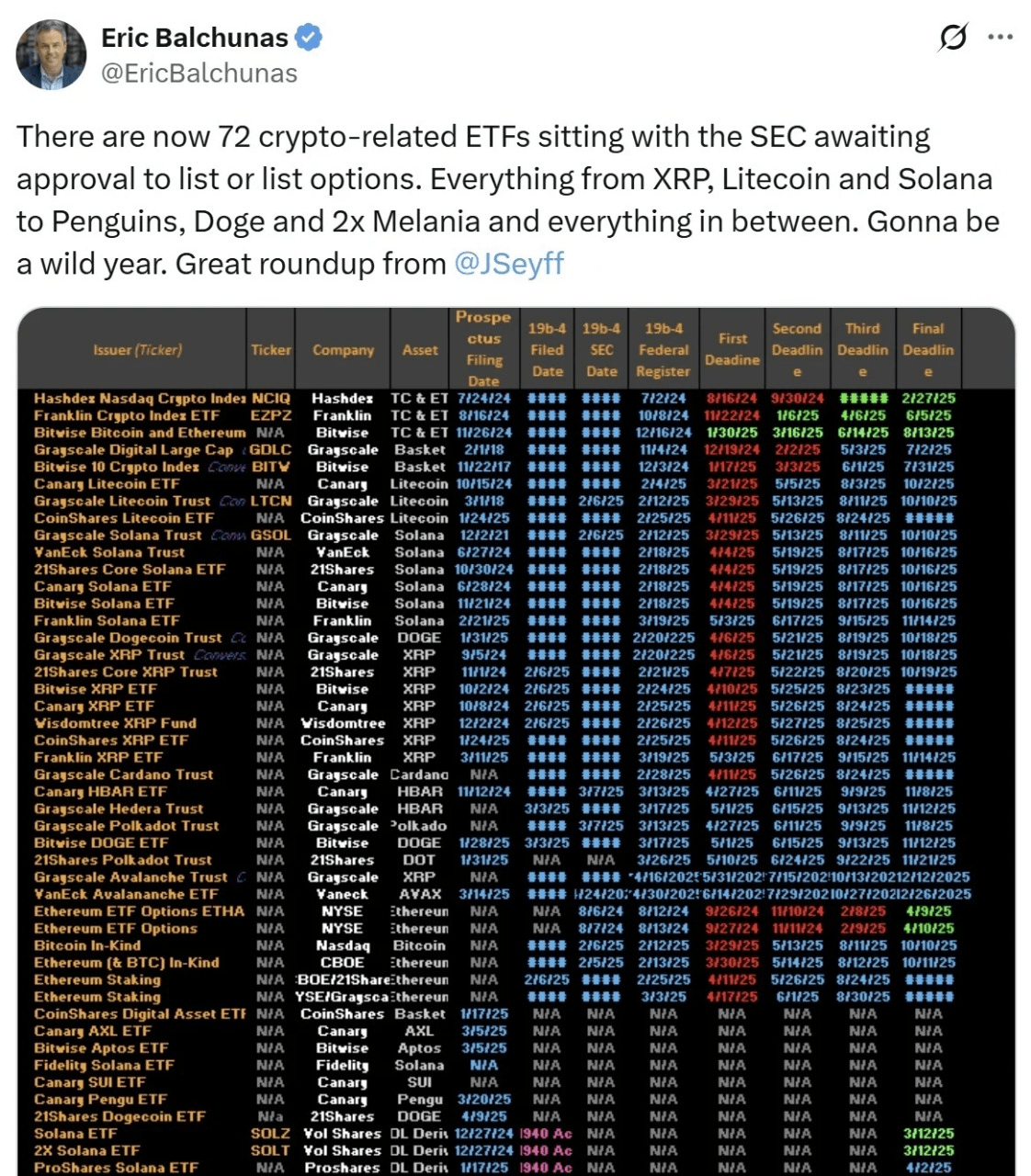 Hinweis > Oft mit sehr hohen Chancen (bis zu 95% bis Ende 2025) zitiert, aufgrund seiner etablierten Natur und dass es von der SEC im Allgemeinen nicht als Wertpapier klassifiziert wird. Endfristen für einige Anträge sind im Oktober.