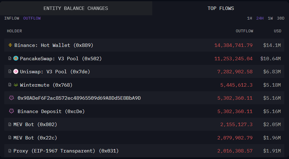Tokens, die in die Binance „Hot Wallets“ oder „Deposit“-Adressen fließen, bedeuten normalerweise, dass jemand Tokens an die Börse sendet, um zu handeln oder zu halten. Tokens, die aus diesen Wallets herausfließen, könnten bedeuten, dass jemand auf eine persönliche Wallet abhebt (vielleicht um langfristig zu halten oder auf eine andere Plattform zu wechseln).