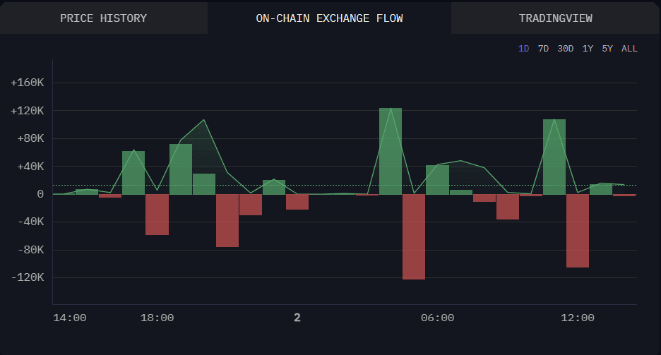 Du kannst große grüne Spitzen sehen — das ist, wenn viele Tokens IN die Börsen oder Pools kamen. Große rote Spitzen — Tokens VERLASSEN die Börsen oder Pools.