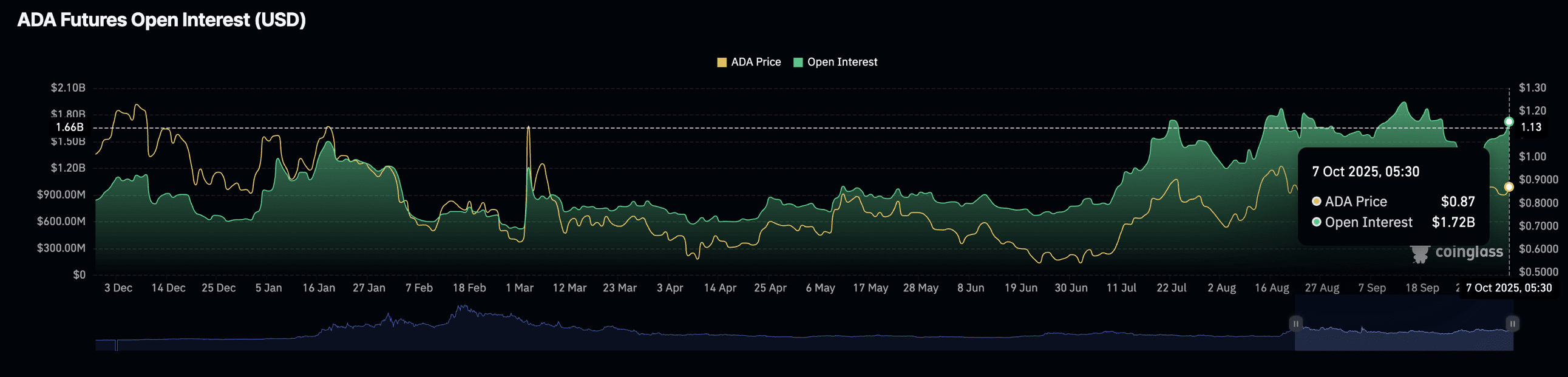 In der Zwischenzeit wächst die Nachfrage im Einzelhandel auch bei den Derivaten $ADA , wobei Daten von Coin Glass zeigen, dass das Open Interest (OI) für Futures von Cardano in den letzten 24 Stunden um mehr als 5 % gestiegen ist und 1,72 Milliarden erreicht hat. Die plötzliche Erholung des OI deutet auf eine Zunahme der Long-Positionen hin, da die Händler mit weiteren Gewinnen rechnen.