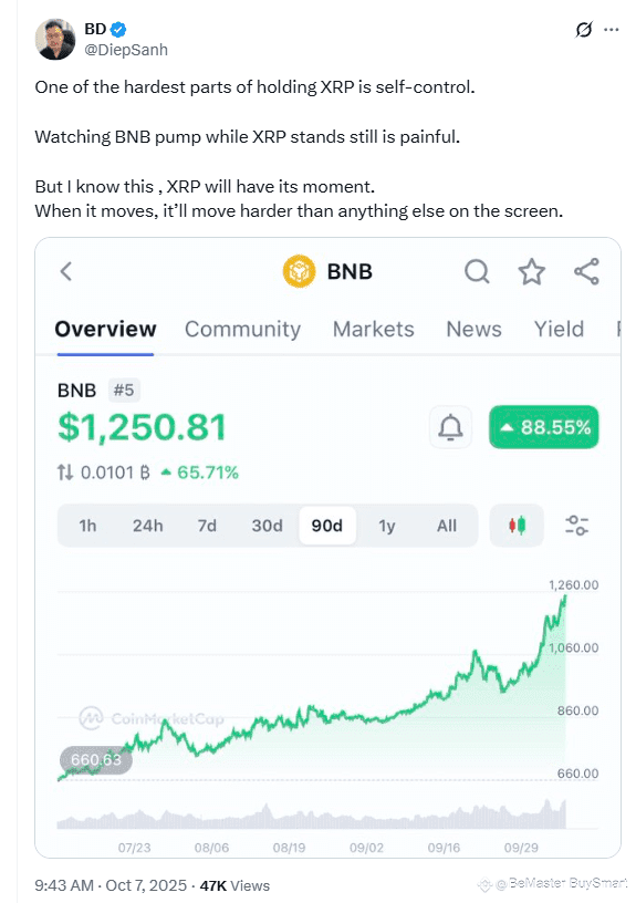 Die Aufmerksamkeit auf die jüngste bullische Kampagne von BNB lenkend, schlug der XRP-Community-Experte Diep Sanh vor, dass der Test der Selbstbeherrschung einer der schwierigsten Teile des Haltens von XRP ist. Dies liegt daran, dass der Altcoin oft zurückbleibt, wenn andere Vermögenswerte beeindruckende Gewinne erzielen, was bei Investoren Unruhe auslöst und zu einem Hang führt, ihre Bestände zu verkaufen.