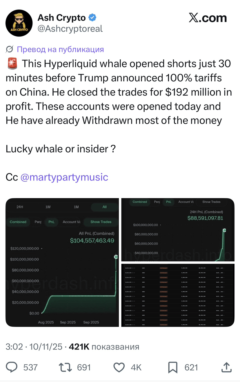 Ein großer Trader von Hyperliquid eröffnete Short-Positionen 30 Minuten vor Trumps Ankündigung.