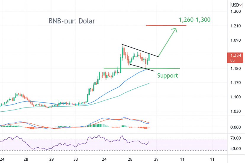 • Es gibt auch Hinweise auf die Bildung eines bullischen Flags, was darauf hindeuten könnte, dass der Aufwärtstrend nach einer kurzen Korrektur fortgesetzt wird.