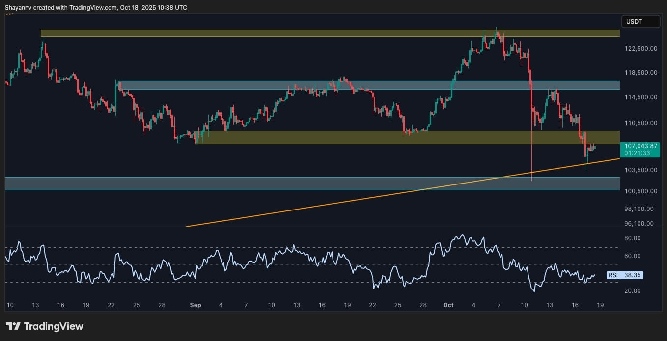 Bei näherer Betrachtung wird deutlich, dass BTC eine kleinere Basis um 105.000 US-Dollar nach dem Durchbruch der Niveaus von 115.000 US-Dollar und 109.000 US-Dollar gebildet hat. Das Asset kämpft darum, die Zone von 108.000 US-Dollar bis 109.000 US-Dollar zurückzugewinnen, die sich nun in Widerstand verwandelt hat. Darüber hinaus erholt sich der RSI leicht, fehlt aber immer noch an starkem Impuls und schwankt um 38.