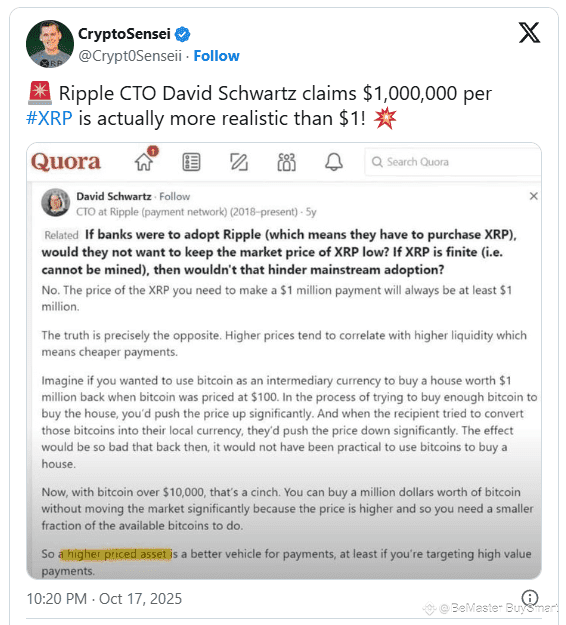 $XRP Eine wachsende Diskussion innerhalb der XRP-Community stellt einen der am längsten bestehenden Überzeugungen im Bereich Krypto in Frage – dass ein niedrigerer Token-Preis besser für die Akzeptanz ist. Diese kühne Idee, die nun weit verbreitet auf X zirkuliert, legt nahe, dass ein höherer Preis pro XRP tatsächlich seine Effizienz als globales Abwicklungsgut steigern könnte.